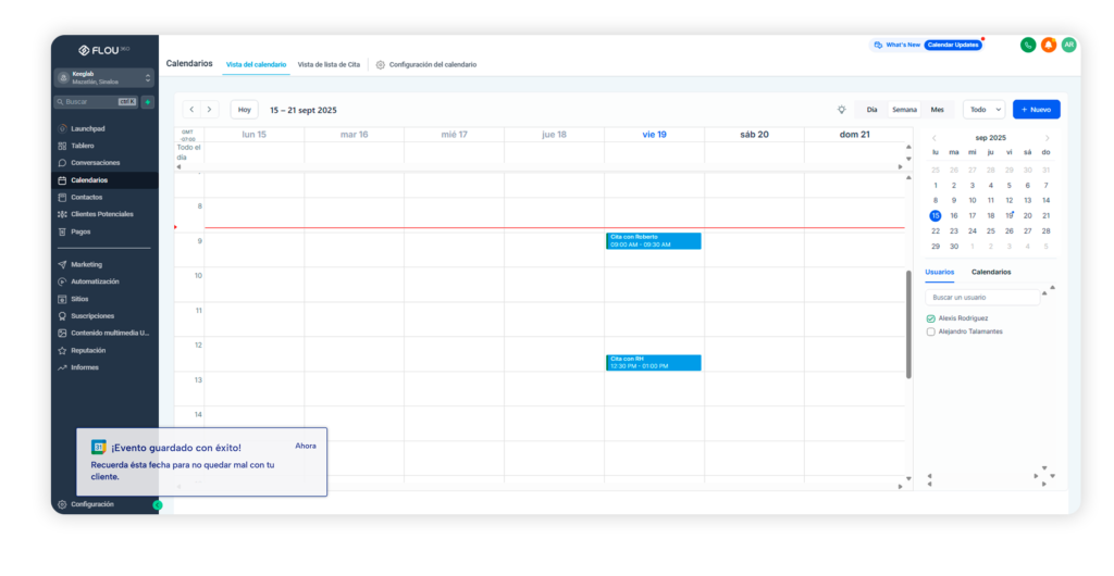 Una consultoría B2B integra su calendario en Flou 360. Los leads que llegan desde su landing pueden agendar directamente una reunión con el equipo de ventas. Con recordatorios automáticos, reducen en un 30% las ausencias.